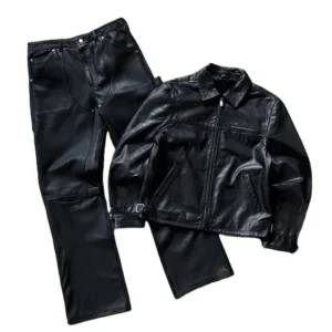 Trendy two-piece set featuring a sleek zip-up leather jacket and PU stacked flare pants.